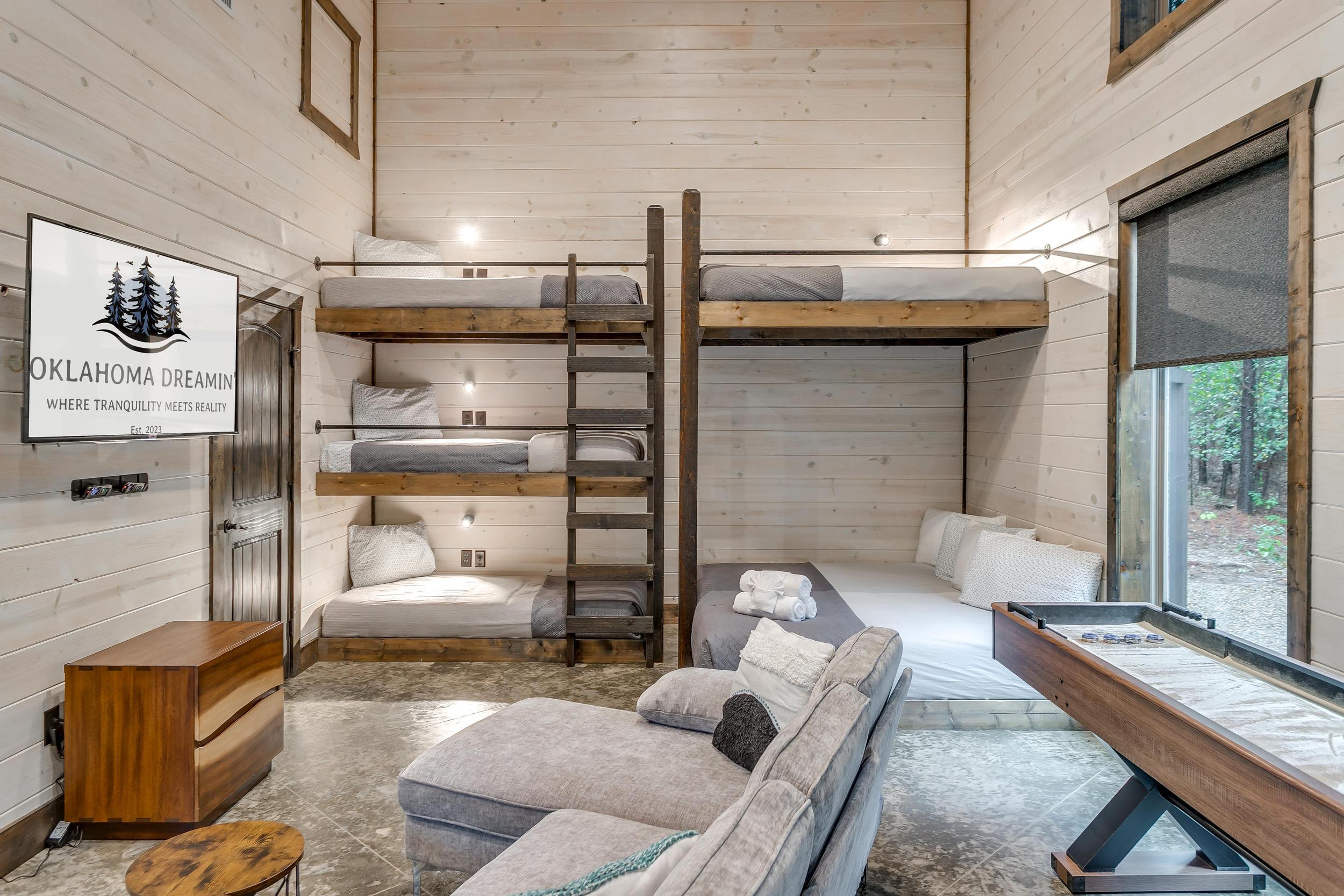 3 Bedrooms • 4 Bathrooms (3 full, 1 half) 4 Baths (3 full, 1 half) • Sleeps 7-11Nestled amongst towering pines on a dead end street, Oklahoma Dreamin' is a spacious 3 bedroom cabin that offers a serene escape from the everyday hustle and bustle. Tucked away in seclusion while still being a short drive to nearby attractions it provides a tranquil sanctuary where you can unwind and reconnect with nature. You are just minutes away from all that Broken Bow and Mountain Fork River have to offer, or just stay in and enjoy all the cabin has to offer. Enjoy a fully stocked kitchen, game room for adults and kids, hot tub, fire pit area for stargazing or s'mores!